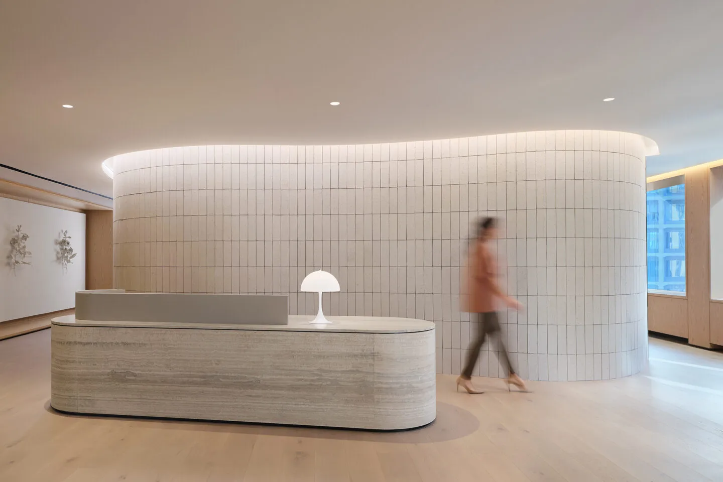 The resulting interior is deliberately restrained, calm, and enduring in character, defined by a tone-on-tone palette that privileges material nuance, texture, and light over contrast. Taking a more sophisticated approach to corporate graphic identity, SCB translated Hallstar’s global presence and industry focus into subtle, three-dimensional design elements. Custom botanical sculptures representing each of Hallstar’s international locations are integrated into the reception area as architectural moments rather than applied artwork. Rendered in a gentle tonal expression, these elements offer an artful identity, spatially anchoring the arrival experience while reinforcing Hallstar’s connection to nature and to the health and beauty sector. Elsewhere, a curated art program is woven through the workplace to introduce selective moments of color, layering visual energy and narrative depth into the otherwise restrained environment. Together, these interventions function as both spatial markers and storytelling devices, offering a subtle, values-driven expression of brand without overwhelming the architecture.