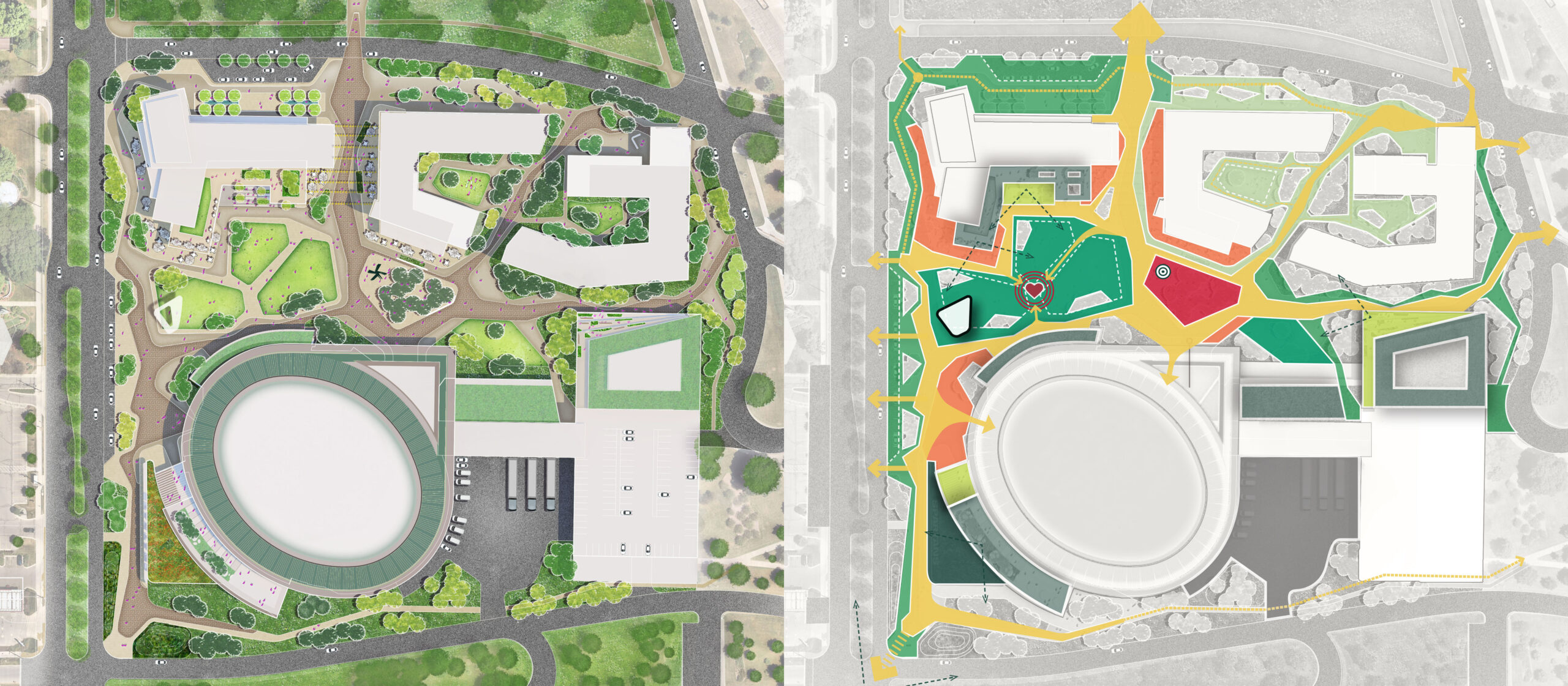 The team’s concept was to anchor the site at the gateway corner with a 6,000 seat sports arena, complemented by a 175 key boutique hotel, 250 residences, a 100,000 square foot office building, and a 400 bay parking structure. The key elements of the site’s program were arranging around a signature open space that would serve as an everyday “front yard” for the local community, and as a game-day activity zone. Retail and community program elements facing the interior open space add to ground-level activation. Pedestrian connectivity through the site from key abutting nodes is strongly privileged, as is a car-free environment at the site’s heart.